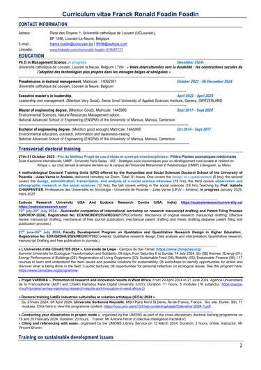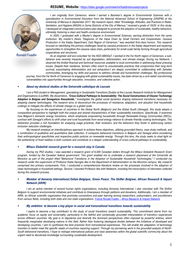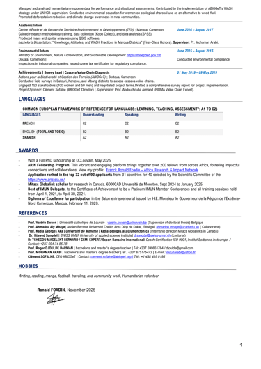 FOADIN.F.F.R.(2020). « Diagnostic de la chaîne de valeur par les petits agriculteurs et les coopératives : Production de manioc dans le département de la Kadey, région de l'Est du Cameroun », mémoire d'ingénieur en conception en sciences de l'environnement, École nationale supérieure polytechnique (ENSPM) de l'Université de Maroua. J'ai obtenu la note de 16/20.