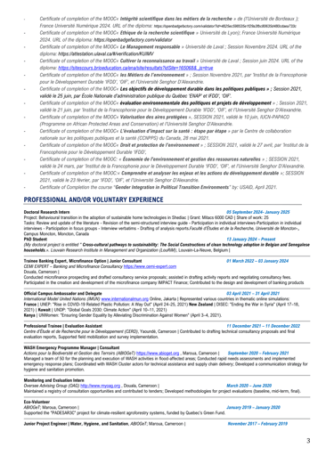 FOADIN.F.F.R.(2017). « Connaissances, attitudes et pratiques en Eau, Assainissement et Hygiène (EHA) dans quelques quartiers de la ville de Maroua » Rapport d'étude d’ingénieur des travaux en éducation à l'environnement, École nationale supérieure polytechnique (ENSPM) de l'Université de Maroua. J'ai obtenu la note de 16/20.